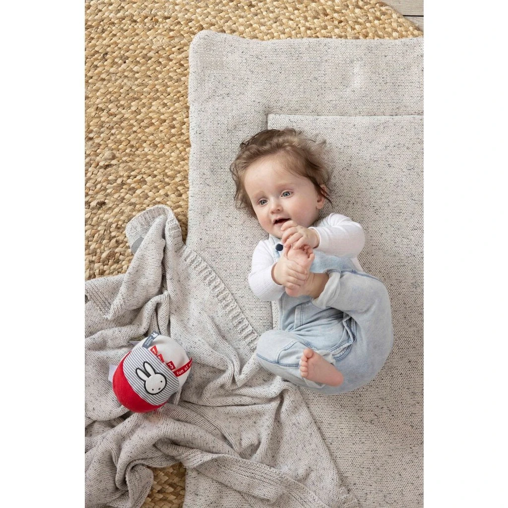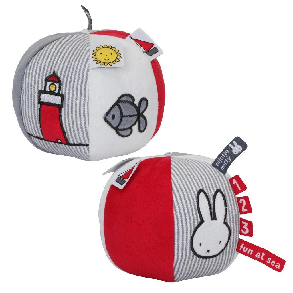 Nijntje bal gemaakt van zachte materialen, in grijs met wit gestreepte uitvoering uit de Fun at Sea collectie. Beschikt over een rammeltje en verschillende afbeeldingen. Diameter: ongeveer 10 cm. Op 30 graden wasbaar in de wasmachine. Geschikt voor alle leeftijden.