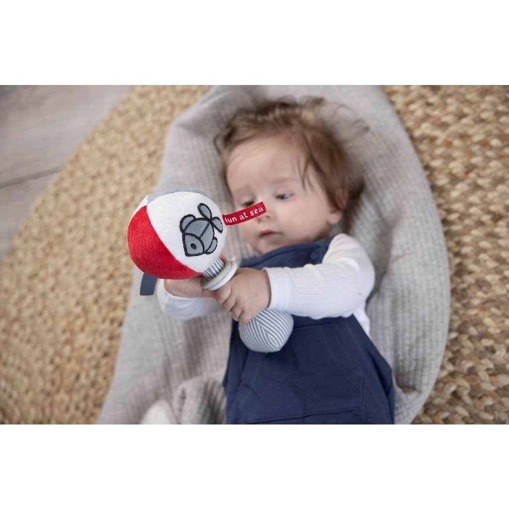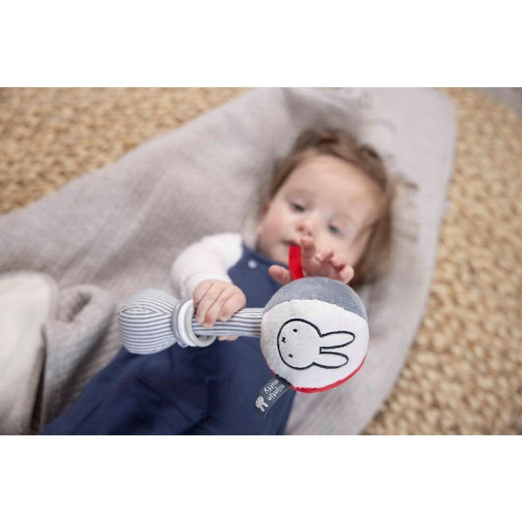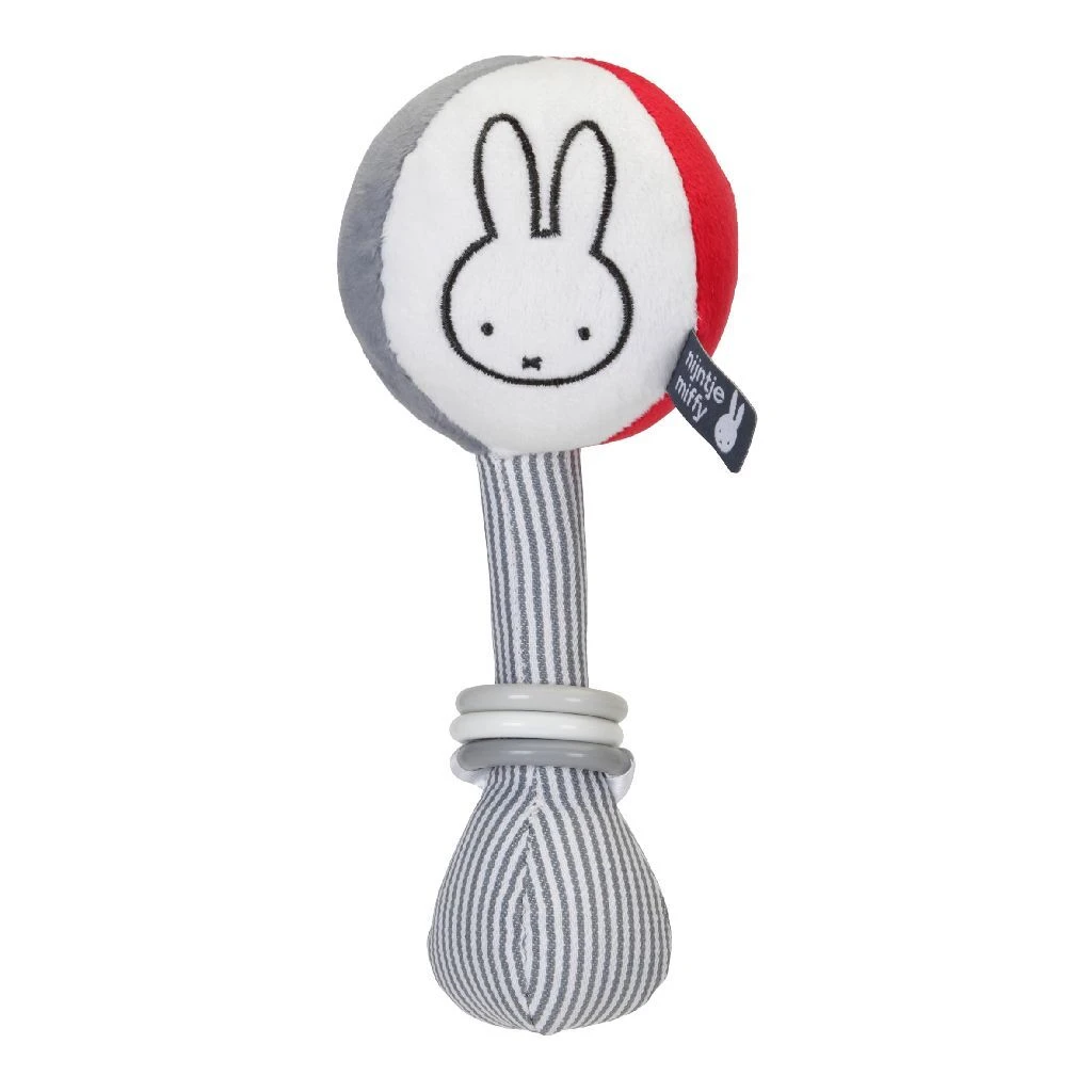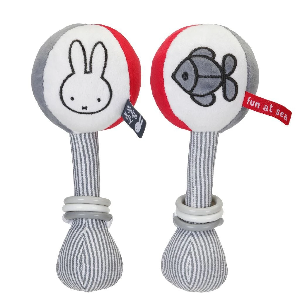 Zachte Nijntje balrammelaar, stimuleert de ontwikkeling van de eerste hand-oog coördinatie. In grijs met wit gestreepte uitvoering uit de Fun at Sea collectie. Ongeveer 25 cm groot. Op 30 graden wasbaar in de wasmachine. Geschikt voor alle leeftijden.