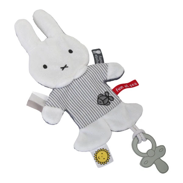 Nijntje knisperspeendoekje, in grijs met wit gestreepte uitvoering uit de Fun at Sea collectie. Het knisperpapier zorgt voor een leuk ritselgeluidje. Daarnaast zitten er leuke labels aan het doekje, en is er een koord, waaraan je de speen kunt bevestigen. Geschikt voor alle leeftijden.