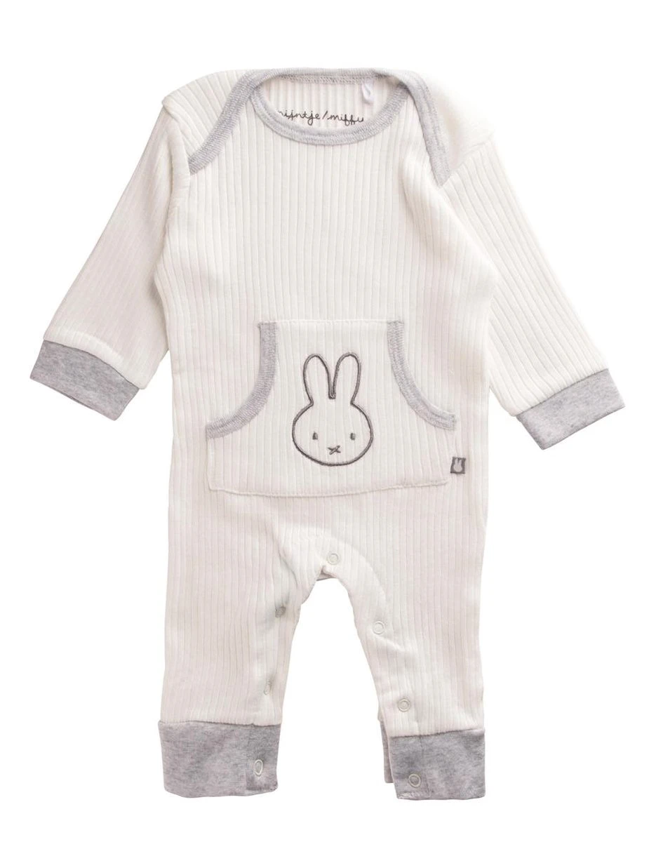 Lief en hip Nijntje boxpakje lange mouw. Het Nijntje boxpakje heeft een beensluiting met drukknoopjes die doorlopen tot in de pijpjes en de elastische boordjes. Het pakje heeft een kangaroo zakje met een Nijntje borduur op het voorpand. Het offwhite boxpakje heeft grijsmele boordjes en biesjes. Dit pakje is gemaakt van een zachte elastische rib stof met een streep breisel.