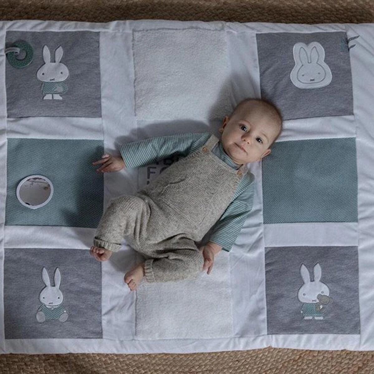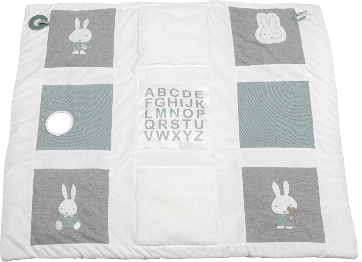 Je kindje kan heerlijk spelen op dit prachtige boxkleed uit de Nijntje Green Knit collectie van Tiamo. Het kleed is voorzien van 9 verschillende vlakken, die zijn voorzien van verschillende afbeeldingen van Nijntje en verschillende activiteiten. Op het boxkleed zit bijvoorbeeld een spiegeltje, bijtring, het alfabet en verschillende stofjes. Het boxkleed is gemaakt van zacht materiaal, zodat je kleintje comfortabel kan liggen en kan zitten! Door de afmetingen van 85 x 100 cm is het boxkleed geschikt voor in de meeste boxen, maar het kan natuurlijk ook gewoon buiten de box gebruikt worden!