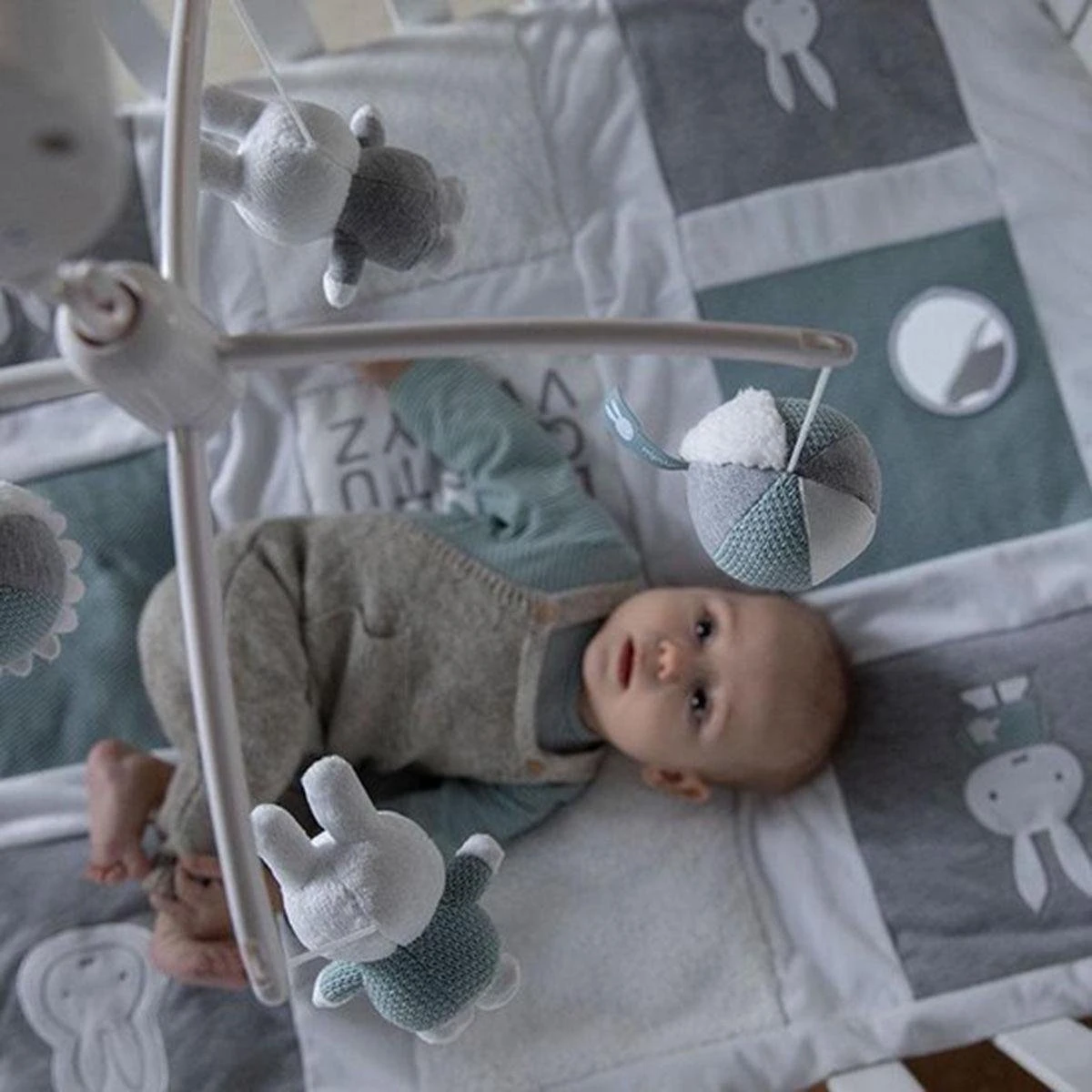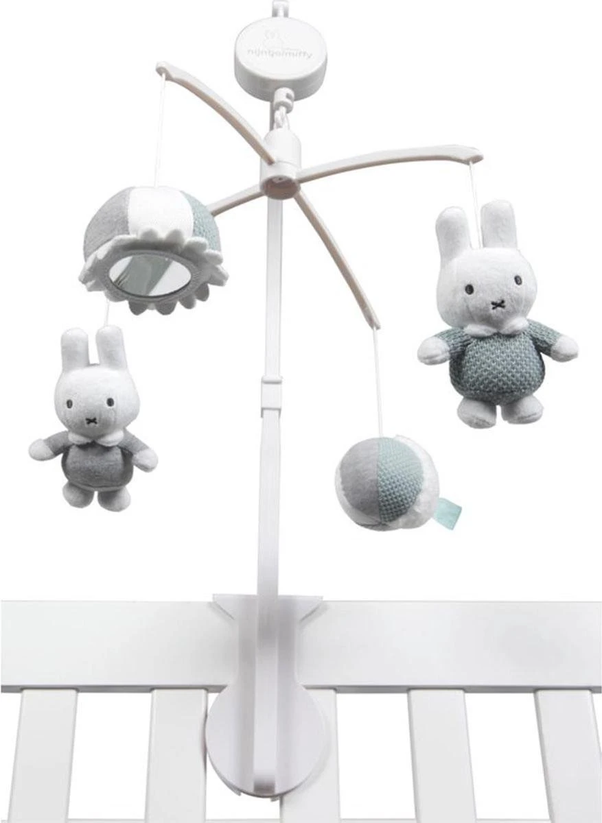 De muziekmobiel van nijntje is eenvoudig te bevestigen aan de box. De muziekmobiel heeft één melodie: Altijd Is Kortjakje Ziek. Aan de mobiel hangen 4 speeltjes: twee konijntjes, een balletje en een spiegel. Een muziekmobiel werkt rustgevend voor de baby en leert je kleintje om te leren kijken en te volgen.